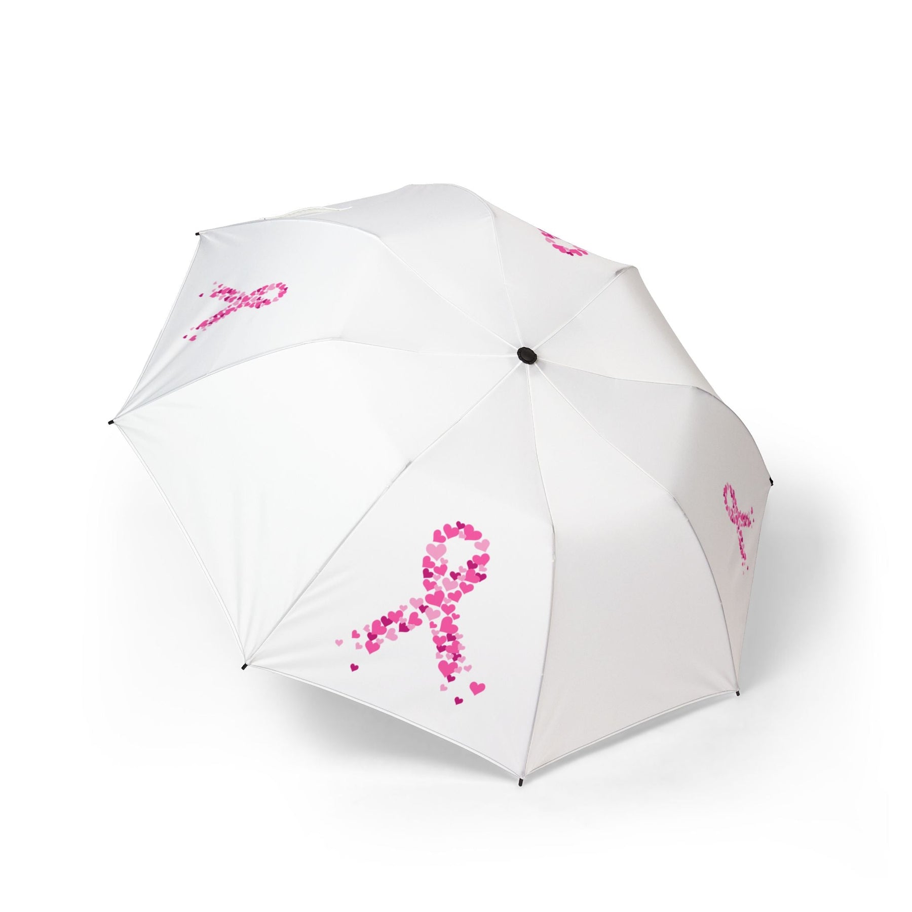 Parapluie blanc avec rubans roses en forme de cœurs. Alliez style et engagement pour Octobre Rose. Léger, pratique et 100 % solidaire contre le cancer du sein.